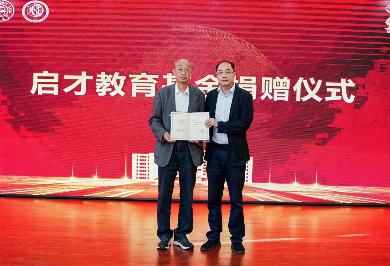 启才教育基金发起者姜启川为天津辉锐激光科技有限公司董事长齐欢、2000级校友刘志钢颁发捐赠纪念证书,以感谢他们对学校和学院发展的大力支持。