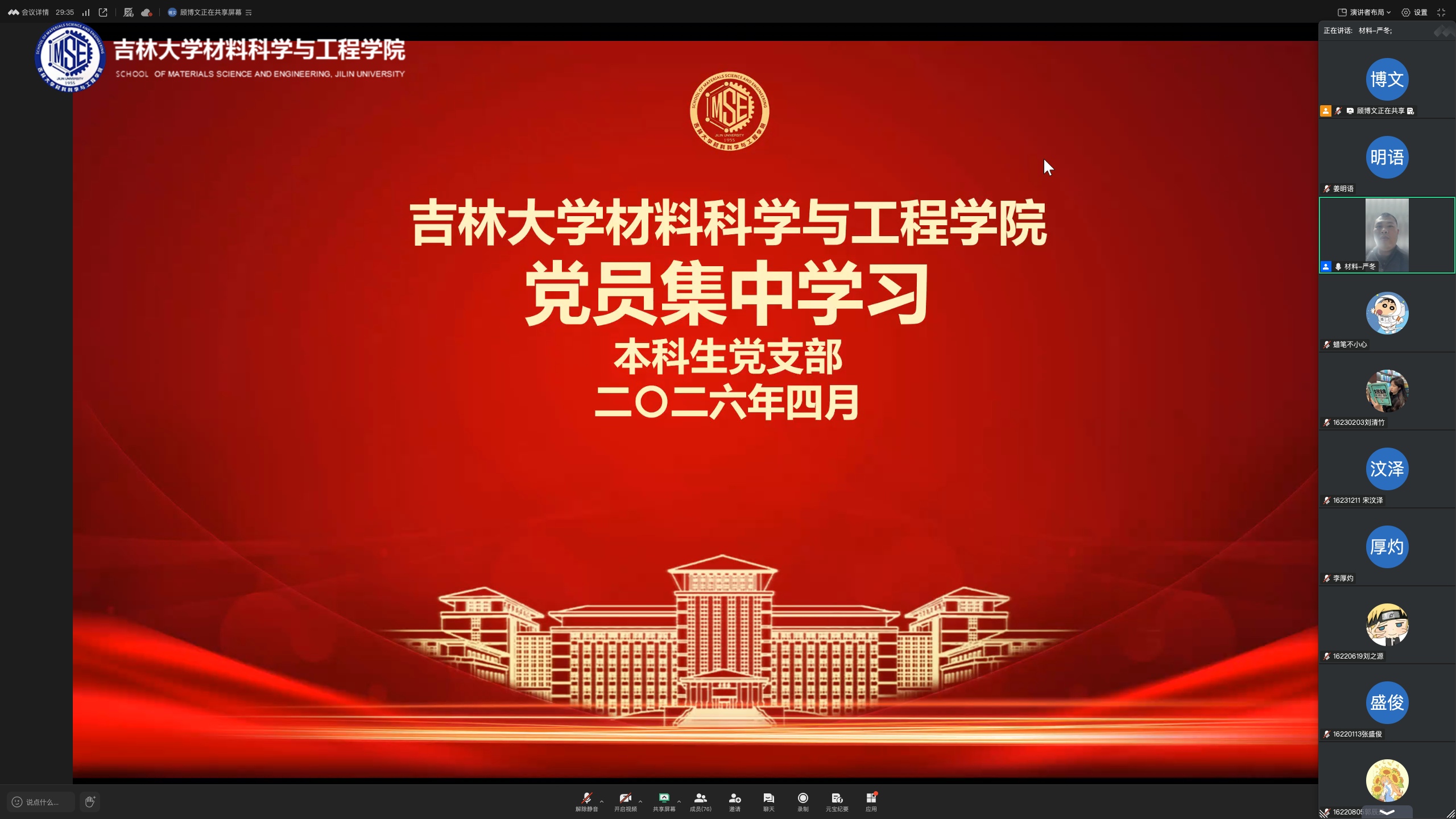 集体学习结束后,本科生毕业年级学生党员顾博文同学表示,要以党员的标准严格要求自己,立足专业、勤学笃行,努力成长为符合国家需求的材料领域青年人才。最后,本科生第二党支部书记严冬老师对本次活动进行总结,希望同学们深刻认识到材料学科对于国家制造业升级、关键技术攻坚的重要意义,进一步明确自身所肩负的时代使命与专业责任。
